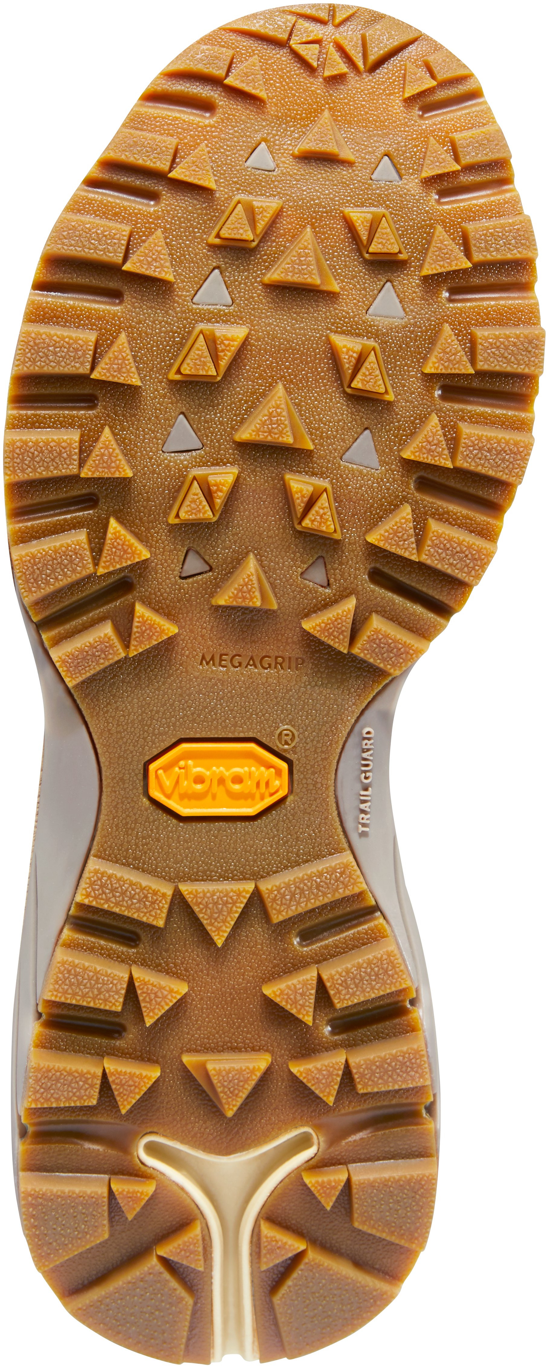 - This exclusive outsole features multi-directional lugs and a split heel for adaptive traction with Vibram’s Megagrip compound for incredible grip on wet and dry surfaces.